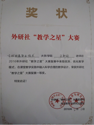 2016年8月5日在南京举办的外研社“教学之星”讲课大赛中,我院基础部英语教研室王新丽老师获高职高专组“教学之星”大赛复赛一等奖。