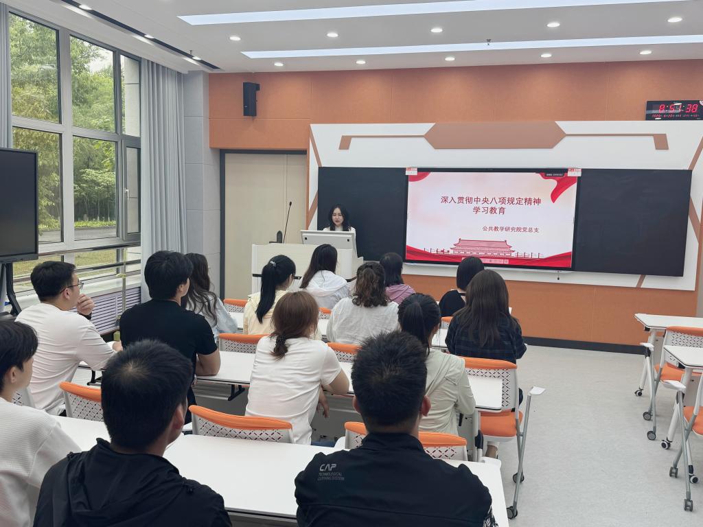 6月20日,公共教学研究院党总支在教学楼215智慧教室召开深入贯彻中央八项规定精神学习教育专题会议。会议由学院党总支副书记于藕主持,学院教师参会。
