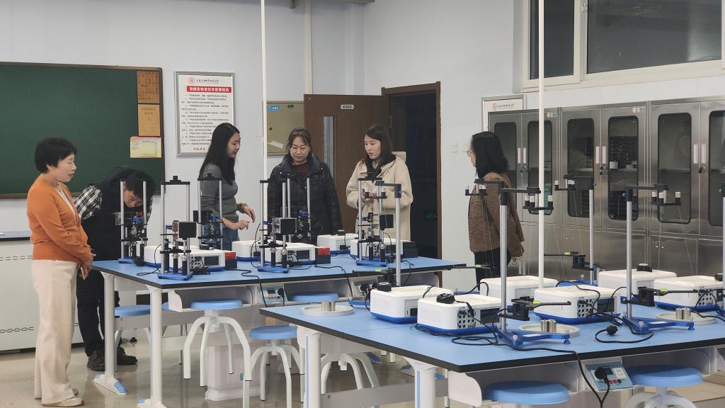 同日下午,团队赶赴北华大学理学院进行调研交流。北华大学理学院朱丽丽教授全面介绍物理教研室建设、师资结构、课程特色及教改成果,双方针对教学重难点、教研项目申报、学科竞赛指导等内容深入交流。随后,团队参观该校物理实验室,实地考察功能布局、设备运维及教学组织情况,吸收实践教学先进经验。